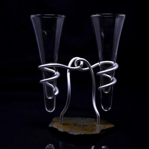2 flûtes d’une contenance de 17 cl. / Hauteur. 20 cm Support en métal couleur argent et socle en ardoise.